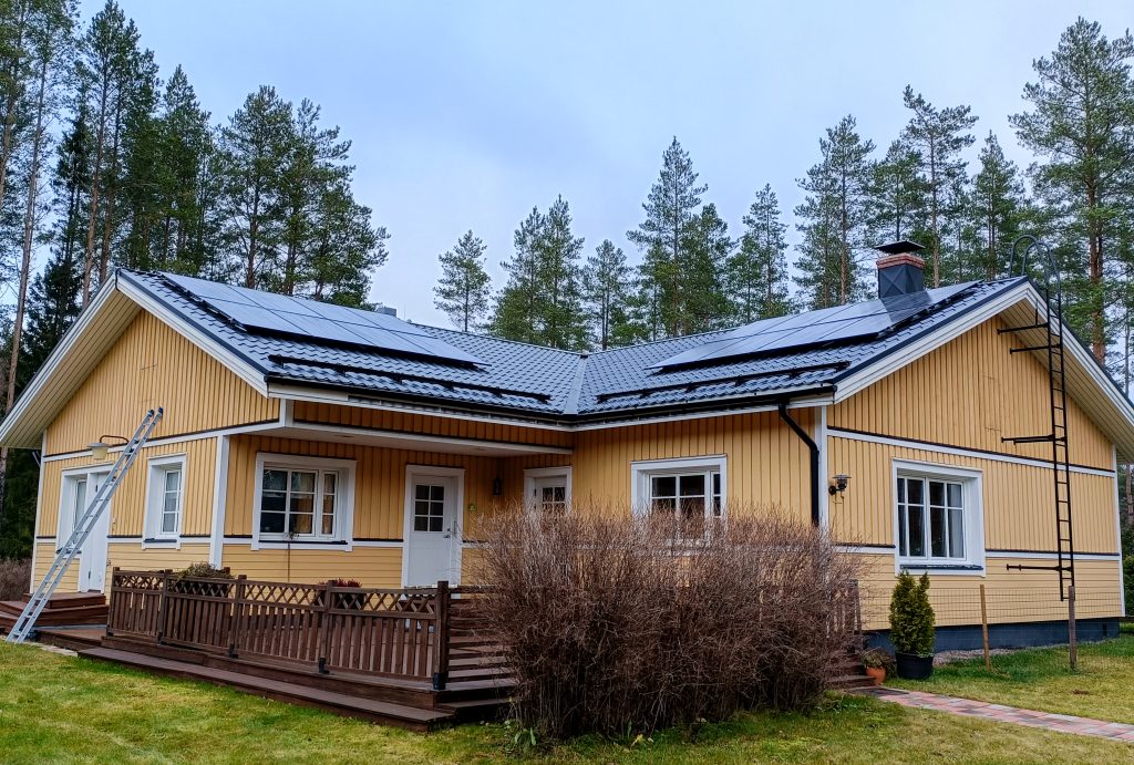 6,6kWp, asennus kahteen ilmansuuntaan. Tiilikuvioitu peltikatto.